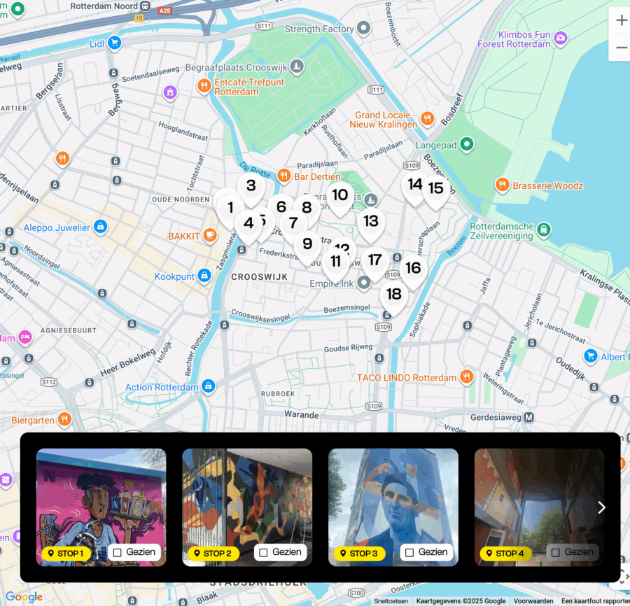 De route neemt je mee langs iconische plekken uit de Crooswijkse geschiedenis: van de Koninginnekerk die als mural opnieuw tot leven komt, tot de bokstraditie rond Herman van ’t Hof en Bep van Klaveren, en het monumentale portret van Def Rhymz midden in de buurt waar hij opgroeide. Tussendoor duik je in onderwaterwerelden, geometrische illusies, typografie en cartooneske karakters die laten zien hoe divers de Rotterdamse streetartscene is.